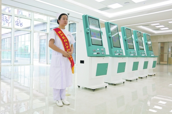 7月3日,在贵安医院门诊大楼一楼大厅,护士孙艾芸正向市民详细介绍自主挂号机的使用方法。“在新医院工作,我们都很愉快。”孙艾芸说,医院给医护人员安排了倒班宿舍、交通班车等,为大家解决了后顾之忧,可以全心全意投入工作中。