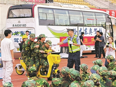 日前,贵安新区公安局交警支队二大队走进贵州轻工职业大学和贵州电子科技职业学院,为正在军训的大一新生送去“交通安全第一课”。